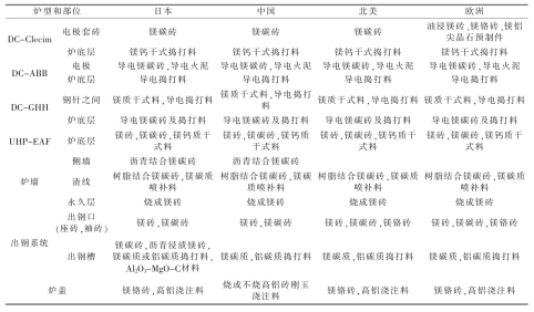 摘 要:由三根電極的普通交流電弧爐發(fā)展為超高功率(UHP)及一根電極的直流(DC)電弧爐,爐體結(jié)構(gòu)有一些改變。針對(duì)各部位的損毀因素,內(nèi)襯用的耐火材料也有所發(fā)展。例如普通電弧爐的爐頂用高鋁磚、爐墻鎂磚砌筑,而UHP及DC電弧爐采用大面積水冷爐頂、爐墻,爐頂三角區(qū)采用剛玉澆注料或預(yù)制件,爐墻用鎂碳磚,蝕損嚴(yán)重部位采用噴補(bǔ)作業(yè)。還介紹了日本等一些國家DC和UHP的各種爐型用耐火材料。煉鋼電弧爐是以電極端部和爐料之間發(fā)生的電弧為熱能進(jìn)行煉鋼的設(shè)備。電弧爐以廢鋼為爐料直接煉鋼,與礦石煉鐵后再煉鋼相比,基建投資少,節(jié)能60%、節(jié)水40%、減少廢氣排放86%、減少廢渣97%[1]。交流電弧爐歷史悠久,交流電是通過三根石墨電極輸入爐內(nèi),在電極下端與金屬料之間產(chǎn)生電弧,利用電弧高溫直接加熱爐料,使煉鋼過程得以進(jìn)行。供電功率越高,爐料熔化速度越快,降低能量消耗越多,因此出現(xiàn)超高功率(UHP)電弧爐。在超高功率的基礎(chǔ)上發(fā)展了直流(DC)電弧爐煉鋼。直流電弧爐是以一根石墨電極的端點(diǎn)為陰極,爐底為陽極,石墨電極位于爐膛中心部位。與UHP相比設(shè)備結(jié)構(gòu)簡單,建設(shè)費(fèi)用低,熔池中的電流與熱量分布比較均勻,不存在過熱區(qū)域,因此耐火材料損耗比較小、節(jié)能且噪音小等。目前,煉鋼電弧爐向大型化、控制自動(dòng)化方向發(fā)展。我國的電弧爐主要用來生產(chǎn)合金鋼。煉鋼水平與工業(yè)發(fā)達(dá)國家相比差距較大,如2015年我國電爐鋼占粗鋼總產(chǎn)量的6.1%,2020年有所提高,但也不超過10%,與世界平均水平的30%相比還有較大差距。我國已經(jīng)引進(jìn)先進(jìn)水平的UHP和DC電弧爐,隨著經(jīng)濟(jì)發(fā)展,工業(yè)化程度提高,必然伴以廢鋼資源數(shù)量增加,同時(shí)發(fā)展鐵礦石直接還原煉鐵技術(shù),代替廢鋼,增加電弧爐煉鋼的爐料,還有核電的發(fā)展,使電弧爐煉鋼有了物質(zhì)保證。電弧爐的內(nèi)襯是耐火材料構(gòu)成的,隨著UHP和DC技術(shù)的發(fā)展,需要新型優(yōu)質(zhì)耐火材料與之相配套。有人說[2]:沒有優(yōu)質(zhì)爐襯、爐底耐火材料支持長壽爐齡,超高功率電弧爐就無法發(fā)揮高效生產(chǎn)的優(yōu)勢(shì)。爐底耐火材料是直流電弧爐得以實(shí)現(xiàn)的必要條件,反映了煉鋼與耐火材料技術(shù)的互相影響,互為依存,在電弧爐煉鋼系統(tǒng)優(yōu)化生產(chǎn)中有不可分割的作用。1 電弧爐的結(jié)構(gòu)變化傳統(tǒng)的電弧爐由爐頂(又稱爐蓋)、爐墻、爐坡、爐底和出鋼槽構(gòu)成,全部用耐火材料構(gòu)筑,外包鋼制爐殼。爐墻一側(cè)設(shè)有爐門,另一側(cè)為出鋼口,并與出鋼槽相連。而UHP和DC電弧爐采用偏心爐底出鋼,使?fàn)t體由傾動(dòng)式改為固定式,爐底有供氣攪拌設(shè)置,爐頂安裝氧-燃料燒嘴,在爐底偏心位置設(shè)置出鋼口,代替出鋼槽。由于取消了傾動(dòng)設(shè)備,擴(kuò)大了水冷面積,緩和了爐襯的損毀,適當(dāng)降低了出鋼溫度,并縮短了出鋼時(shí)間,從而降低生產(chǎn)成本。爐墻采用鑲砌水冷箱式水冷套措施,其內(nèi)表面噴涂一層耐火涂料,使其掛渣形成保護(hù)層,可有效降低耐火材料消耗,但電耗可能增加。國外有的電弧爐功率達(dá)1 000 kV·A/t以上,爐墻壽命達(dá)2 000爐次以上,水冷爐蓋壽命達(dá)4 000爐次,降低耐火材料消耗60%以上。2 耐火材料內(nèi)襯的損毀因素電弧爐內(nèi)襯的耐火材料長期處于高溫、熔渣侵蝕和急熱急冷狀態(tài)下,工作條件極其惡劣。在煉鋼的熔化期和氧化期,不致于因高溫?fù)p壞爐襯,但在還原期的鋼液溫度相當(dāng)高,又受電弧直接輻射(有時(shí)溫度達(dá)4 000℃以上),爐襯很容易造成熔融損壞。出完鋼裝料時(shí),爐襯溫度突然下降,裝完料開始送電,溫度又逐漸升高,這種急冷急熱是爐襯剝落的直接原因,主要是爐頂容易剝落。耐火材料內(nèi)襯損毀的主要因素包括[3]:(1)化學(xué)侵蝕。FeO或渣中SiO2與耐火材料中的CaO、MgO之間的化學(xué)反應(yīng),使?fàn)t襯變?yōu)槿墼鴮?dǎo)致?lián)p毀。(2)耐火材料內(nèi)襯中的碳成分被含氧成分(如FeO、O2、MgO等)氧化,導(dǎo)致耐火材料脫碳而損毀。(3)沖刷和機(jī)械沖擊。鋼水或熔渣流過耐火材料表面,以物理性磨損或沖刷爐襯,而導(dǎo)致內(nèi)襯損毀;在出鋼口、渣線、電極口或排氣口平臺(tái)等沖刷嚴(yán)重,廢鋼等爐料吊入往往撞擊爐襯而損毀。(4)水化。在生產(chǎn)過程中,往往會(huì)出現(xiàn)爐頂或爐墻漏水或滲水,還有水蒸氣,與堿性耐火材料中的MgO、CaO進(jìn)行水化反應(yīng),使內(nèi)襯損毀。3 電弧爐用耐火材料根據(jù)電弧爐的結(jié)構(gòu),由于各部位承受的熱負(fù)荷大小不同,與熔渣、鋼水接觸作用及機(jī)械損壞程度存在差異,不同部位必須采用不同的耐火材料[4]。3.1 爐頂(蓋)我國中小電弧爐普遍采用燒成或不燒高鋁磚,局部用高鋁質(zhì)或剛玉質(zhì)不定形耐火材料預(yù)制件。大型超高功率電弧爐和直流電弧爐采用水冷技術(shù),除三角區(qū)外,爐頂耐火材料不是關(guān)鍵。三角區(qū)由于強(qiáng)烈熱震及電極熱輻射苛刻,國外普遍采用剛玉質(zhì)或鋁鉻質(zhì)搗打料,我國一般用高鋁質(zhì)或剛玉質(zhì)搗打料。天津鋼管集